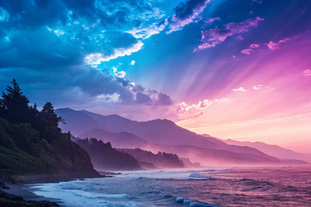 A stunning coastal scene featuring mountains shrouded in mist beneath a vibrant, colorful sunset, as waves crash along the shore, highlighting the beauty of nature. This captivating image conveys peace, tranquility, and the awe-inspiring power of the natural world, ideal for travel, landscape, or inspirational themes.