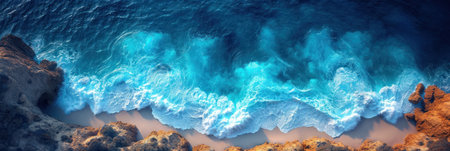 Rugged coast aerial, waves on rocks, blue water with foam, powerful nature design.
