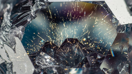 Bright glass shards scatter light, forming a blurred abstract visual. The scene captures various angles and reflections of the shards.