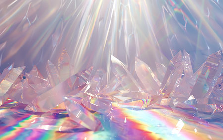 Radiant quartz crystals reflecting light and rainbow patterns.