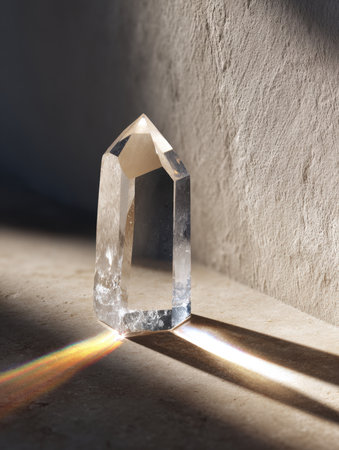 Single Large Clear Quartz Crystal Point Standing on a Stone Surface with a Vibrant Rainbow Light Leak, and Warm Sunlight Flare Creating Magical Reflections and Ethereal Shadows in a Minimalist Room