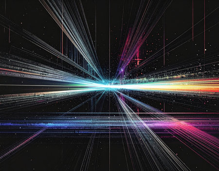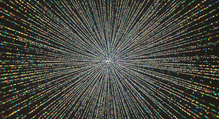 This stunning abstract image showcases vibrant light rays radiating from a central point, creating a visually engaging scene filled with shimmering particles.