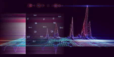 Abstract infographics concept with wavy glow grid data with blurred lines on dark background. Data chart. Big data. 3d grid data chart banner.
