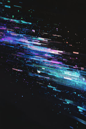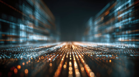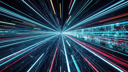 This captivating image features a dynamic stream of data flowing through a digital space, showcasing vibrant light effects that signify technology and information advancement.