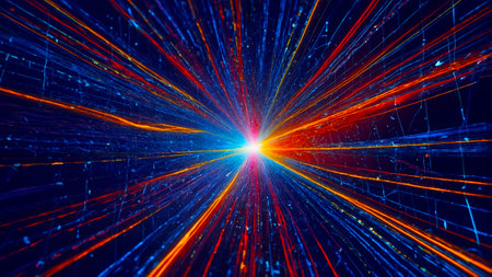 An abstract digital illustration showcases a dynamic flow of light trails. The artwork features streaks of blue, red, and white against a black backdrop, suggesting high-speed data transfer. The composition has an immersive perspective. This imagery is suitable for technological and scientific projects.
