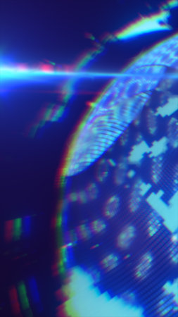 Digital globe with bright blue light rays and glitch effects, symbolizing technology, internet, and data connections.