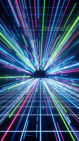 Abstract showing dynamic abstract digital depicting a neon grid and light streaks exploding from a central point in vibrant blue pink and green colors keywords:...