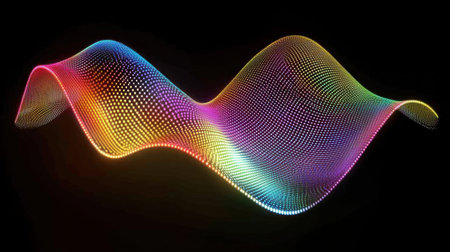 This captivating abstract image features a colorful wave formation composed of dots and light effects against a sleek black background, representing energy and modern design.