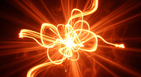 A bright energetic explosion radiates outwards with colorful light rays and lightning bolts against a dark, abstract background.