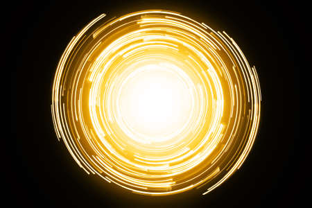 Abstract neon circle lines with empty copy space inside isolated on black background. Colorful led lights long exposure rotation photo. Shiny light source. Cosmos space sun planet abstraction.