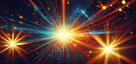 A dynamic abstract image featuring a central burst of light surrounded by radiating lines of blue, red, and gold, creating a sense of energy and movement.