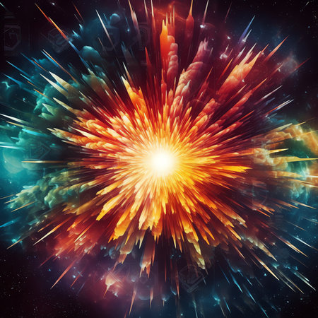 Dynamic cosmic explosion in space with colorful light streaks and stars.