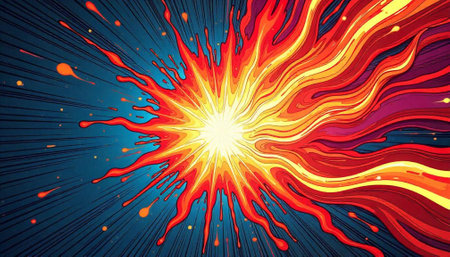 A bright central sunburst emits intense orange and red light streaks that radiate outwards, creating a fiery,...