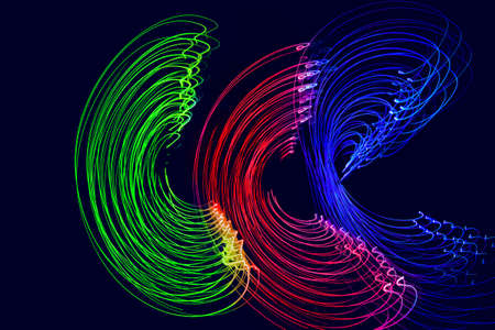 Motion graphics, sci-fi bg. Stream of multicolor neon lines form spiral shape, curls and pattern. Abstract background with light trails, Modern trendy motion design bg. Light flow bg. 3d render