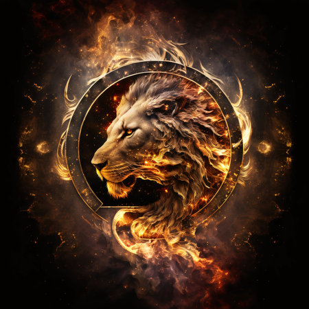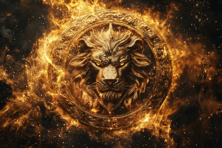 A close-up image presents a lion with a fiery mane and glowing eyes against a black background. The artwork uses warm, vibrant colors, emphasizing textures and details. The composition may be suitable for various commercial purposes, including advertising and editorial content. The lighting creates a dramatic effect.