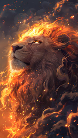 This stunning illustration features a roaring lion made of vibrant flames, symbolizing strength and power. The dramatic glow brings a captivating energy to the artwork.
