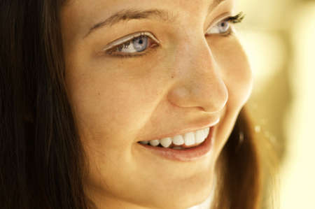 A close-up portrait of a young woman with a genuine smile, her face illuminated by natural sunlight that casts soft shadows. The image captures authentic beauty, happiness, and positive emotion.