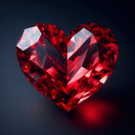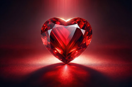 Heart shaped ruby gemstone glowing under spotlight, showcasing its vibrant red color and intricate facets, evokes sense of elegance and luxury