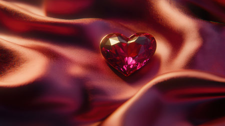 Single heart-shaped ruby glistening on a satin background, illuminated to enhance its romantic appeal