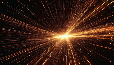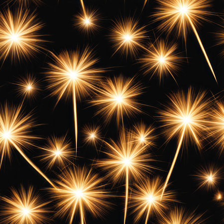 Radiating golden sparks fanning out in dark space, with sparkler creating star-shaped bokeh lights. Dynamic, abstract, vibrant, celebration, illumination, cosmic, energetic