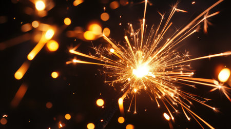 Delicate sparks burst from a lit sparkler, casting a joyful glow in the darkness. Surrounding bokeh lights create a dreamy, festive atmosphere, perfect for celebrations and special moments.