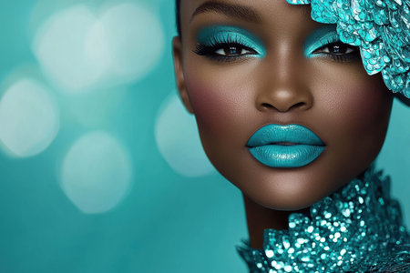 Stunning makeup artistry featuring bold turquoise colors on a model with an elegant headdress in a vibrant setting
