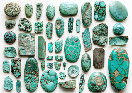 Collection of turquoise gemstones arranged on a white background showcasing various shades of blue and green