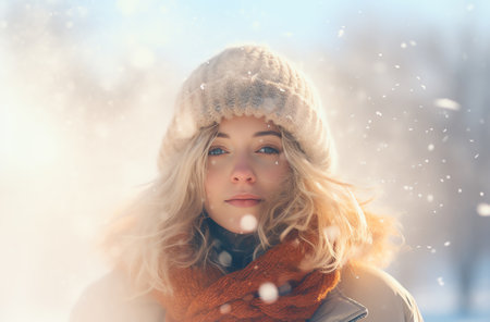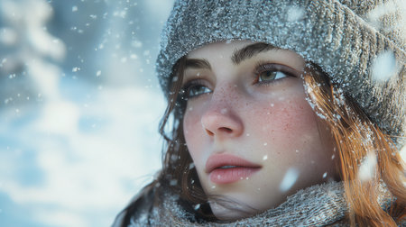 A detailed close-up of a woman wearing a winter hat and scarf, surrounded by falling snow, with a calm and serene expression, capturing the beauty of winter.