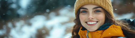 Caucasian young adult woman smiling in winter snow wearing warm hat cozy joyful portrait.