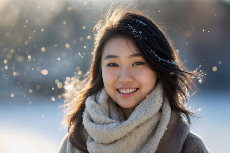 Young Asian woman with radiant smile and flowing hair illuminated by golden sunlight, wrapped in a cozy scarf, surrounded by bokeh and gentle snowfall evoking warmth and seasonal charm
