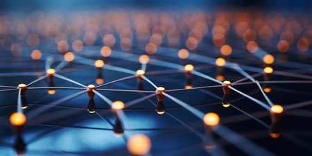 Glowing nodes connected by lines create a digital network design against a dark background.