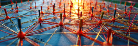Colorful network of interconnected strings and nails at sunset. That the image is generated using AI.