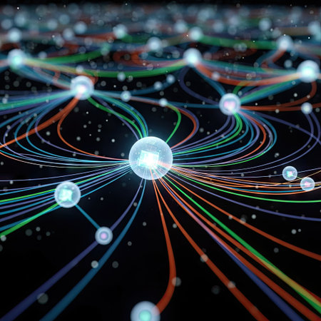 An abstract composition depicts interconnected nodes linked by colorful lines against a dark backdrop. The glowing spheres and vibrant pathways create a sense of depth and activity. This visual could be utilized for representing technological concepts, illustrating connectivity, or illustrating digital landscapes in various commercial applications.