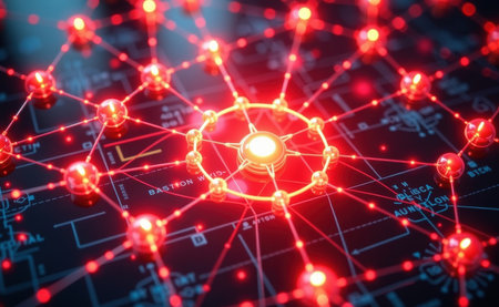 An abstract image showcases a network of interconnected nodes. The composition features sharp lines and blurred areas, while the color palette consists of dark and vibrant red accents. This image could be used in projects related to technology or data visualization, or as a creative background.