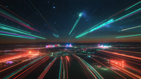 A display of colorful neon light trails crisscrossing against a dark background, evoking a sense of motion and energy. The vibrant streaks of blue, red, and purple lights create a dynamic and futuristic atmosphere.