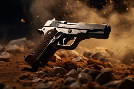 Intense close-up of a gun surrounded by gunpowder residue after firing. A high quality image making by generative ai.