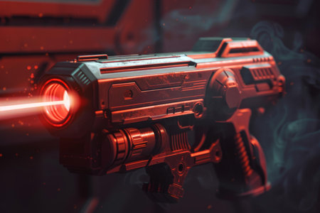 Powerful plasma weapon firing a red laser beam in a dark and smoky environment