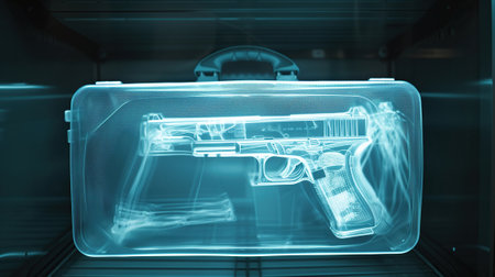 A suitcase with a gun inside is seen on the X-ray screen of the airport security service.