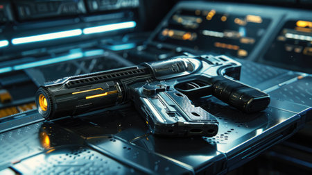 Futuristic gun on metal table inside spaceship, alien machine weapon in spacecraft interior on tech background. Concept of future, space, sci-fi, cyberpunk, game, blaster, technology, military. Generative AI