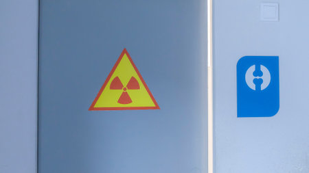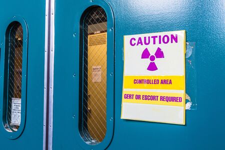 Xray warning signs posted on locked door and wall. Radioactive sign in yellow color on door. X-ray cabinet. Warning about the radioactive danger in hospital.