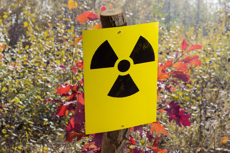 Radioactive pollution. Yellow warning sign with hazard symbol in rural area