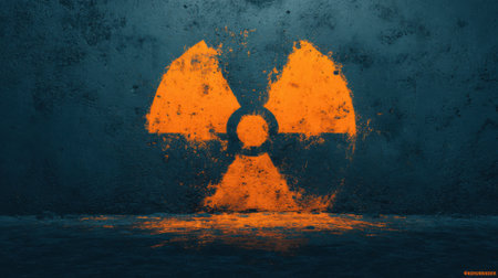 A bright orange radiation symbol stands out against a dark, textured wall, with an artistic splash effect on the surface. The atmosphere feels industrial and mysterious.