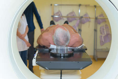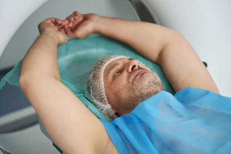 Medical CT or MRI Scan with a patient in the modern hospital laboratory. Interior of radiography department. Technologically advanced equipment in white room. Magnetic resonance diagnostics machine