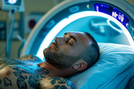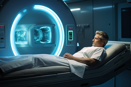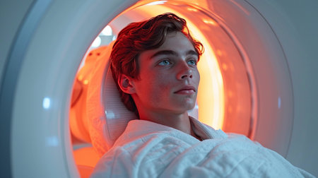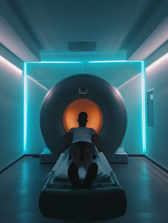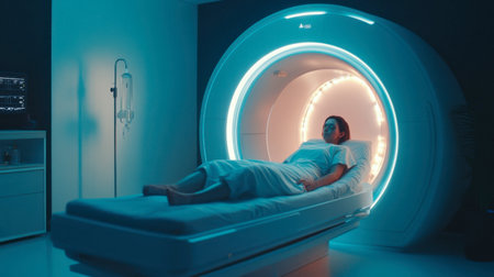 Patient in MRI machine, magnetic resonance imaging, soft lighting