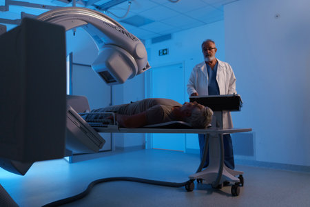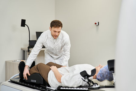 A skilled doctor in a white coat is preparing a female patient for an MRI scan in a modern hospital.