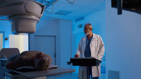 Doctor taking x-ray of patient lying on gurney. Hospital radiology room. Technician adjusting an x-ray machine. Female lying on a bed is scanning chest, heart, lungs in modern clinic office