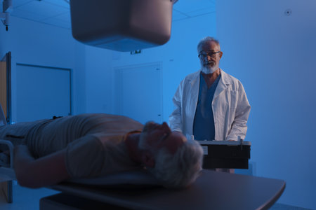 Medical technician monitoring a male patient during a CT scan procedure in a modern hospital. Diagnostic imaging process shown with equipment, scanner, and control room for accurate health check.