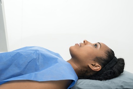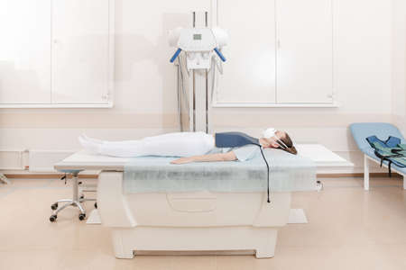 Female patient undergoing x-ray in hospital. Scanning vision.