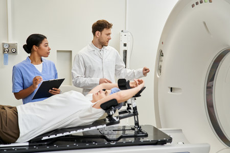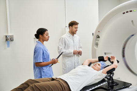 A handsome doctor and an african american nurse assist a female patient near the MRI machine.