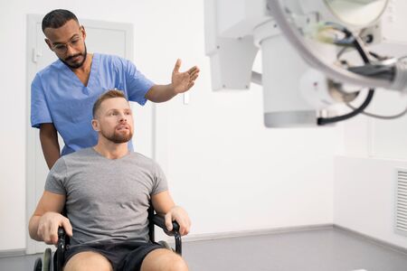 Young doctor in uniform showing sick man on wheelchair new medical equipment